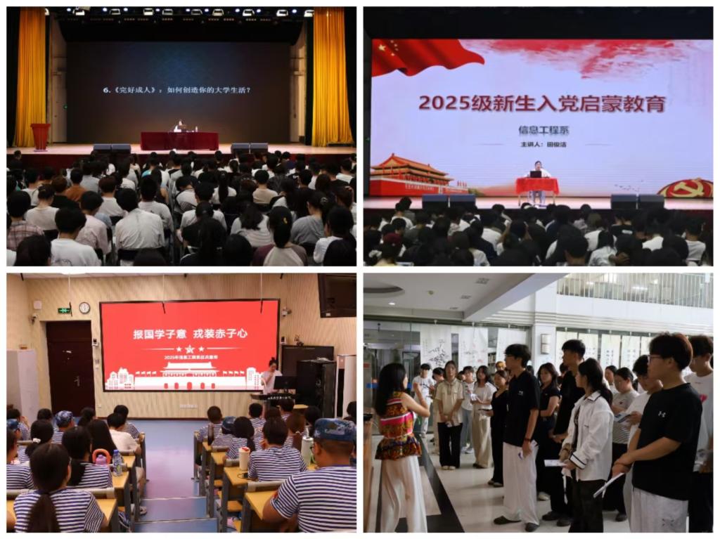 入学教育月伊始,系部高度重视新生的思想引领工作。通过组织观看《大国重器》等科技爱国影片、开展国家安全观与国防教育视频学习、进行征兵宣传等活动,有效激发了新生的爱国热情与报国之志。9月1日,系党总支书记王思文为新生讲授“第一堂思政课”,9月22日,学生支部书记田俊洁以“红‘芯’向党”为主题开展入党启蒙教育,增强了新生对党的政治认同和思想认同。“校园印记”爱校教育活动,则让新生深刻感受到了学院的文化底蕴与信息工程系的发展活力,增强了归属感与荣誉感。